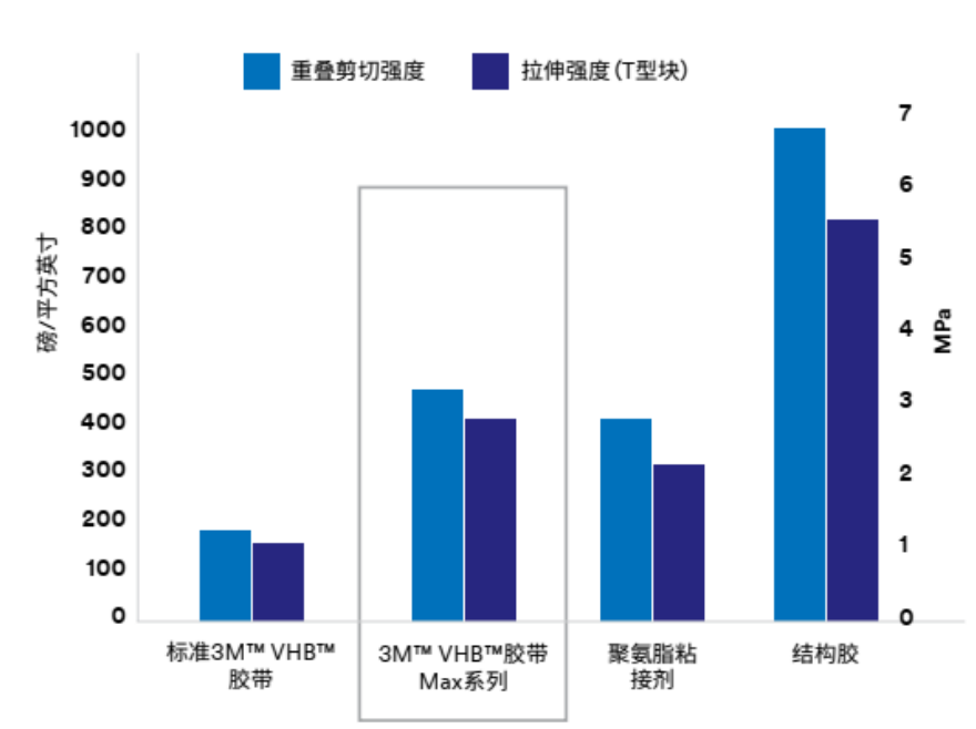 如图所示,Max系列胶带Max-060的重叠剪切强度可以达到3.2MPa, 远超传统的3M™ VHB™ 胶带,达到半结构强度,也高于聚氨酯胶粘剂的强度