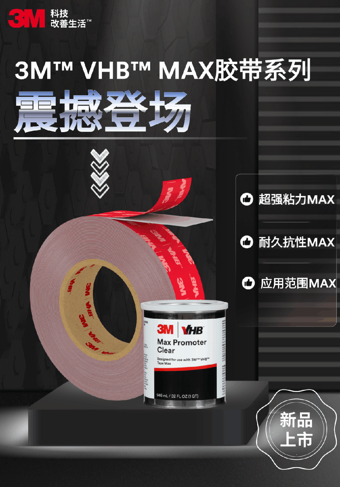 众所周知,3M™ VHB™ 胶带是3M公司在上世纪80年代发明的丙烯酸泡棉胶带,在业界享有很高的知名度,以其强力,高效,持久,美观等特性广泛应用于各个行业。进入2025年,3M即将推出全新的3M™ VHB™ 胶带MAX系列,继续拓展更多更全面的应用场景。