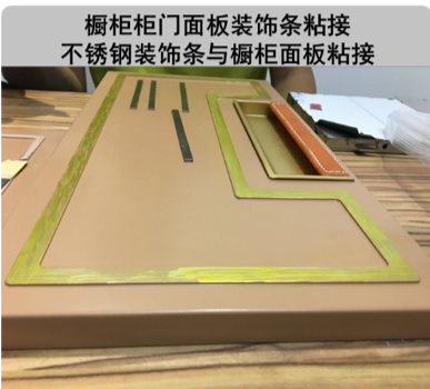 此外,随着橱柜面板的设计逐渐多样化性,越来越多的橱柜面板会贴上不锈钢装饰条后再进行整体喷漆,然而传统工艺使用硅酮胶不仅有溢胶困扰,且固化时间较长,表层固化就需1-2小时,完全固化需要至少24小时,不仅影响美观且会降低工作效率。